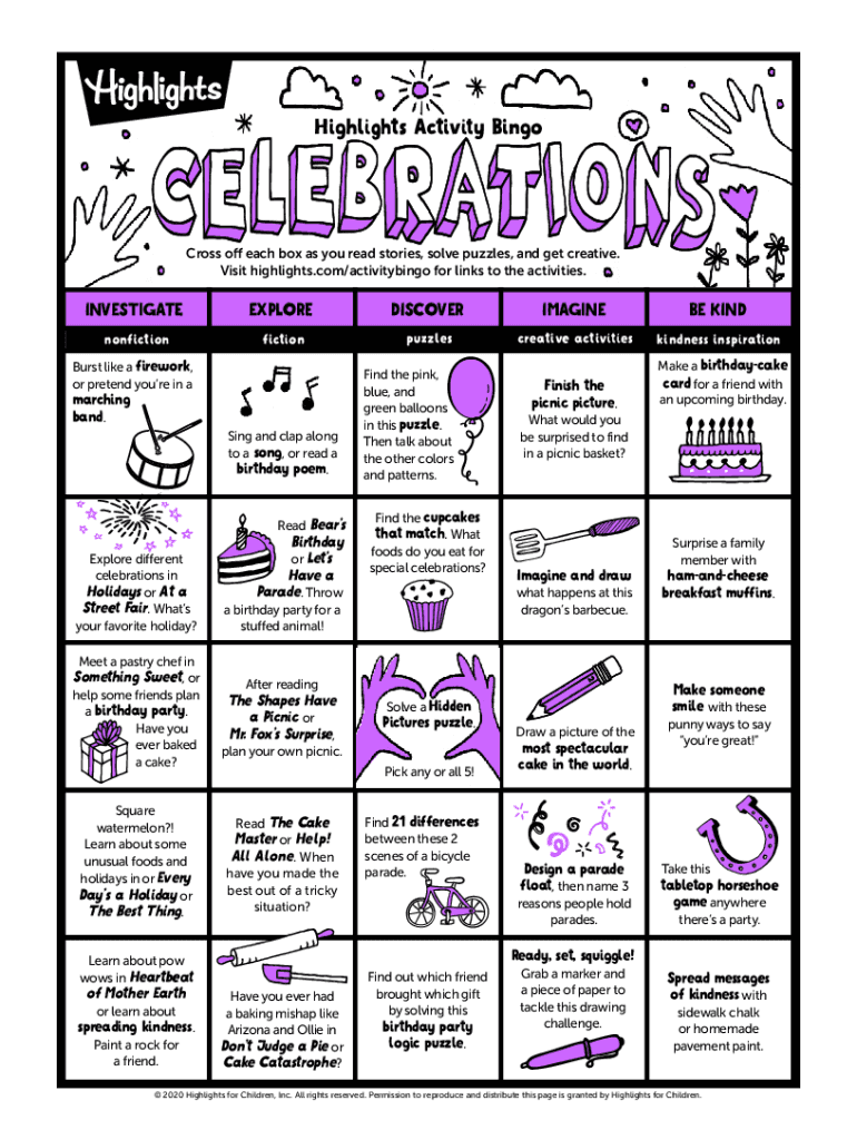 Visit highlights.com/activitybingo for links to the activities.INVESTIGATEEXPLOREDISCOVERIMAGINEBE