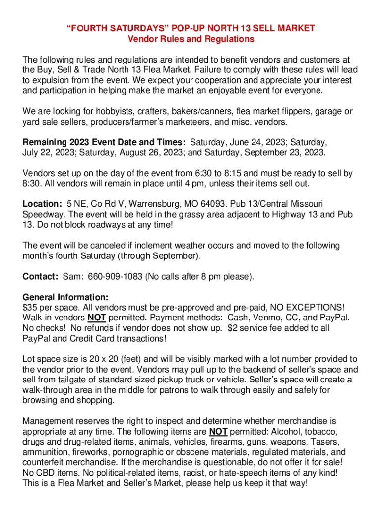 FOURTH SATURDAYS POPUP NORTH 13 SELL MARKET Vendor Rules and Regulations The following rules and regulations are intended to benefit vendors and customers at the Buy, Sell & Trade North 13 Flea Market.
