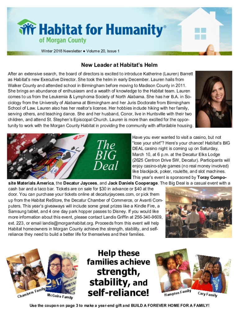 Winter 2018 Newsletter Volume 20, Issue 1New Leader at Habitats Helm After an extensive search, the board of directors is excited to introduce Katherine (Lauren) Barrett as Habitats new Executive