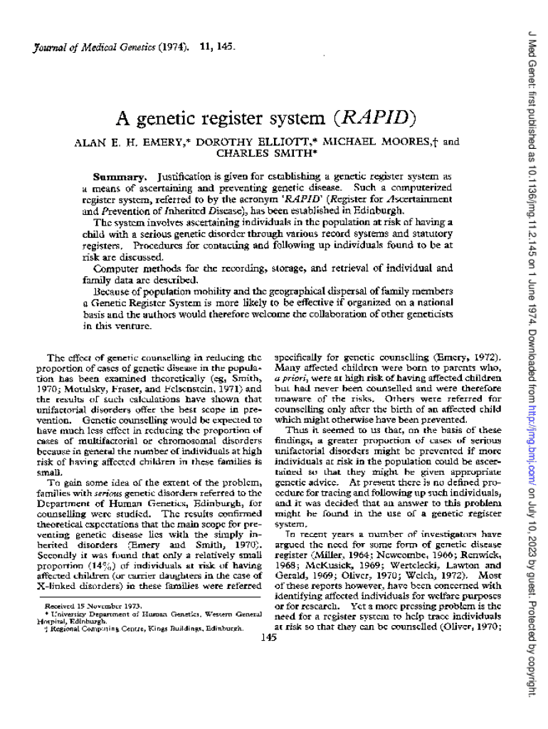 A genetic register system (RAPID) ALAN E. H. EMERY, * DOROTHY ELLIOTT, * MICHAEL MOORE, t and CHARLES SMITH* Summary. Justification is given for establishing a genetic register system as of ascertaining