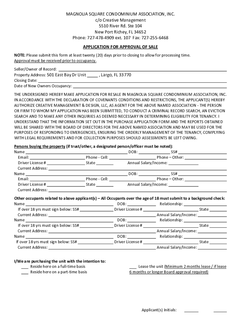 MAGNOLIA SQUARE CONDOMINIUM ASSOCIATION, INC. c/o Creative Management 5510 River Rd. Ste 104 New Port Richey, FL 34652 Phone: 7274784909 ext. 107 Fax: 7272556468 APPLICATION FOR APPROVAL OF SALE NOTE: