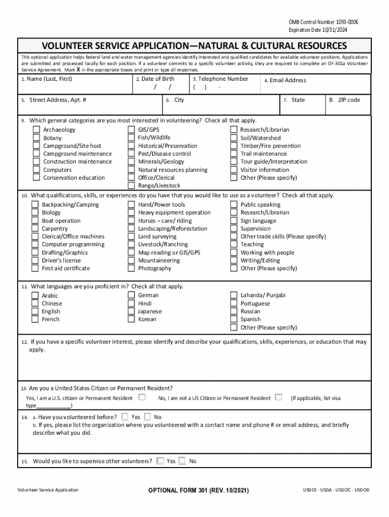 OMB Control Number 10930006 Expiration Date 10/31/2024VOLUNTEER SERVICE APPLICATIONNATURAL & CULTURAL RESOURCES This optional application helps federal land and water management agencies identify