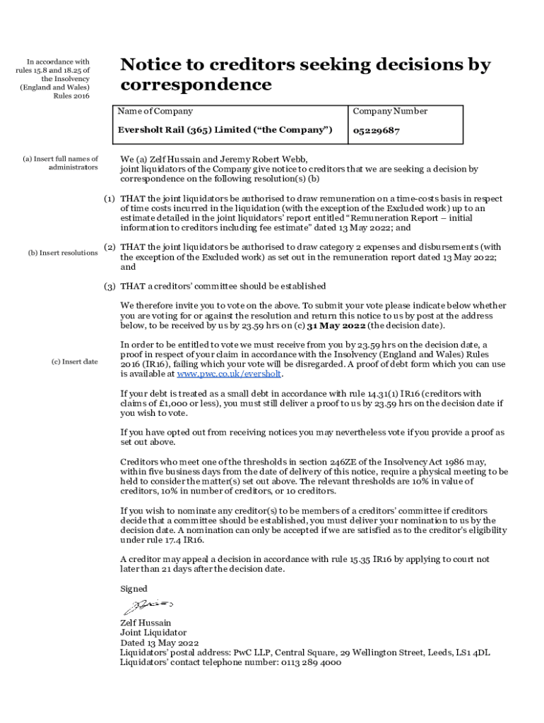 Get the free Notice to creditors seeking decisions by