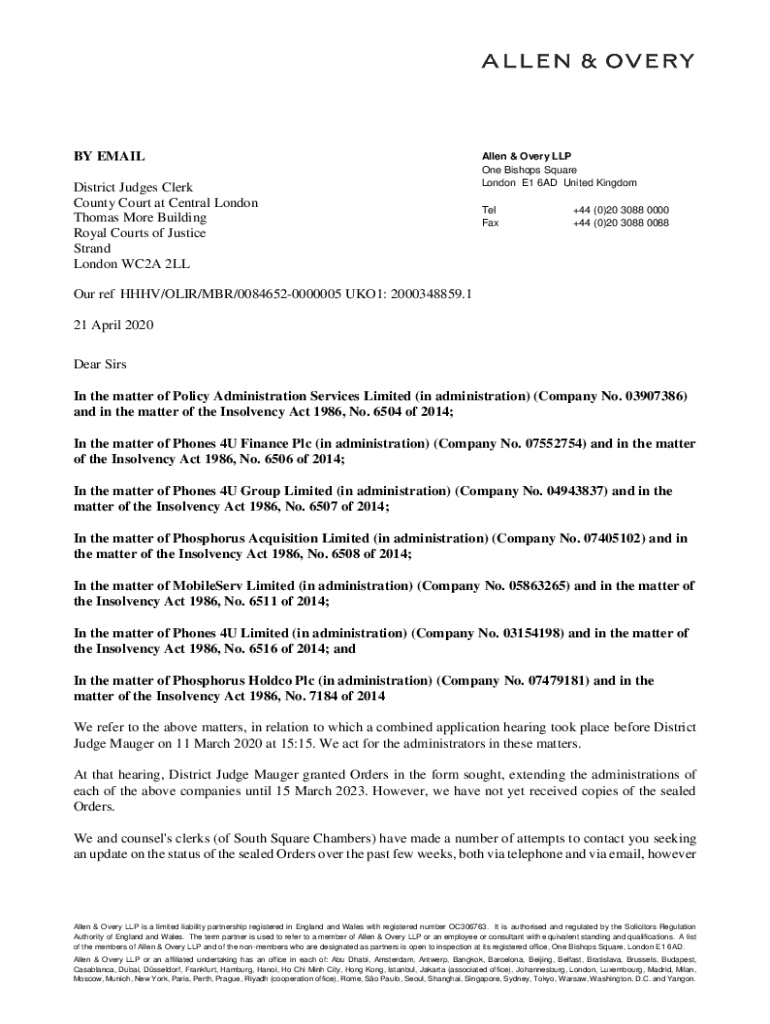 BY EMAIL District Judges Clerk County Court at Central London Thomas More Building Royal Courts of Justice Strand London WC2A 2LLAllen & Very LLP One bishop Square London E1 6AD United Kingdom Tel
