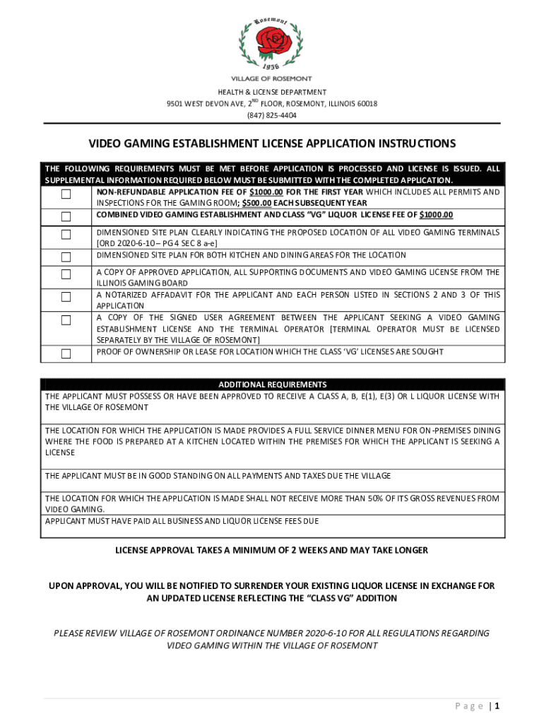 HEALTH & LICENSE DEPARTMENT ND 9501 WEST DEVON AVE, 2 FLOOR, ROSAMOND, ILLINOIS 60018 (847) 8254404VIDEO GAMING ESTABLISHMENT LICENSE APPLICATION INSTRUCTIONS THE FOLLOWING REQUIREMENTS MUST BE MET