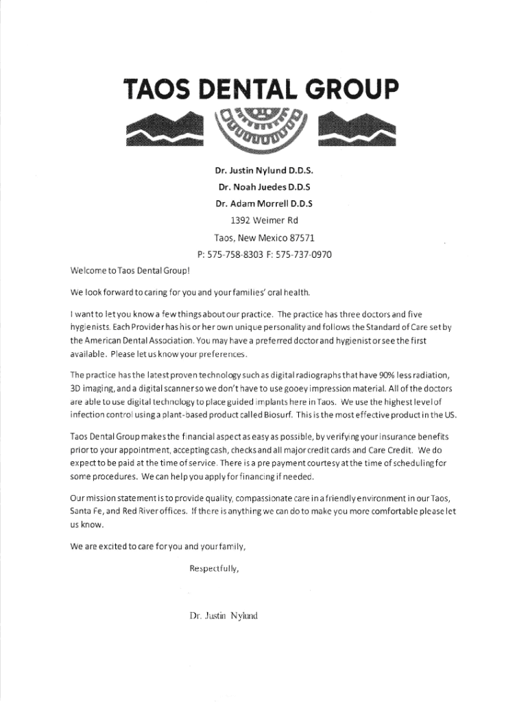 TAGS DENTAL GROUP Dr. Justin Nylon D.D.S. Dr. Noah Judges D.D.S Dr. Adam Morrell D.D.S 1392 Water Rd Tao's, New Mexico 8757L P:5757588303 F: 575737O970Welcome to Tao's DentalGroup! We look forward