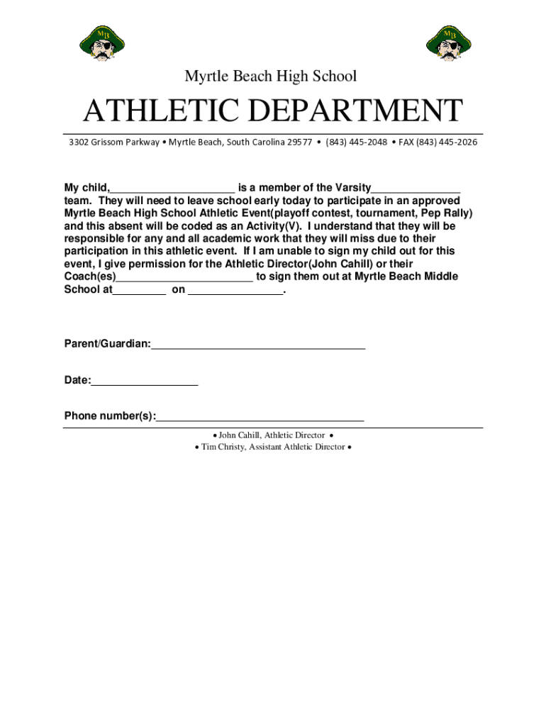 Myrtle Beach High SchoolATHLETIC DEPARTMENT 3302 Frisson Parkway Myrtle Beach, South Carolina 29577 (843) 4452048 FAX (843) 4452026My child, ___ is a member of the Varsity___ team. They will need