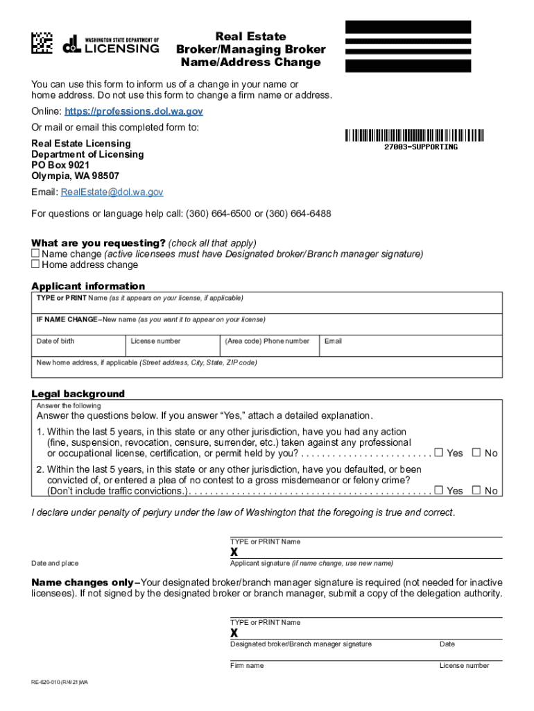 Real Estate Broker/Managing Broker Name/Address Change You can use this form to inform us of a change in your name or home address. Do not use this form to change a firm name or address. Online: https://professions.dol.wa.gov