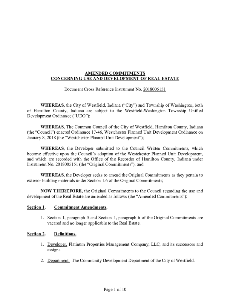 AMENDED COMMITMENTS CONCERNING USE AND DEVELOPMENT OF REAL ESTATE Document Cross-Reference Instrument No. 2018005151 WHEREAS, the City of Westfield, Indiana (City) and Township of Washington, both
