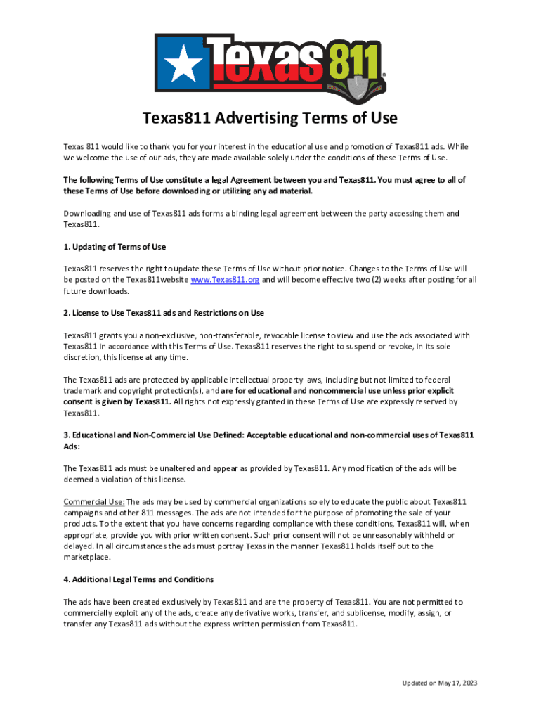 Texas811 Advertising Terms of Use Texas 811 would like to thank you for your interest in the educational use and promotion of Texas811 ads. While we welcome the use of our ads, they are made available