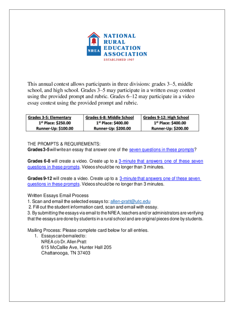 This annual contest allows participants in three divisions: grades 35, middle school, and high school. Grades 35 may participate in a written essay contest using the provided prompt and rubric. Grades