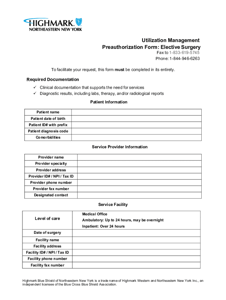 Utilization Management Preauthorization Form: Elective Surgery Fax to 18336195745 Phones: 18449466263To facilitate your request, this form must be completed in its entirety. Required Documentation