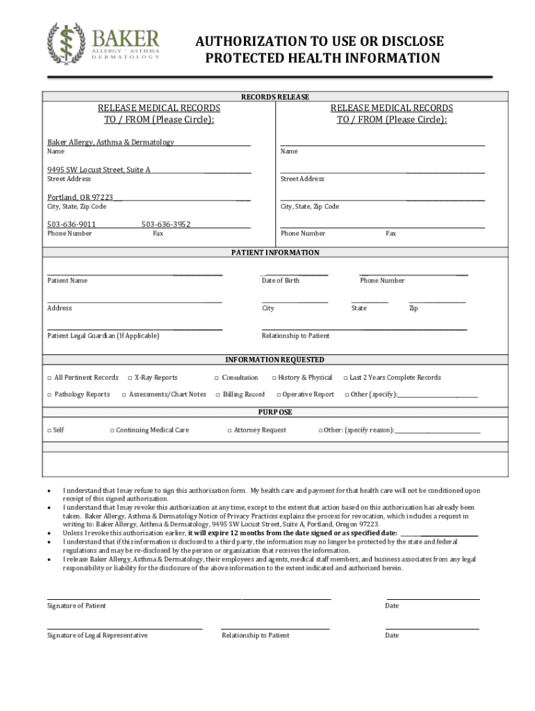 AUTHORIZATION TO USE OR DISCLOSE PROTECTED HEALTH INFORMATION RECORDS RELEASERELEASE MEDICAL RECORDS TO / FROM (Please Circle):RELEASE MEDICAL RECORDS TO / FROM (Please Circle):Baker Allergy, Asthma