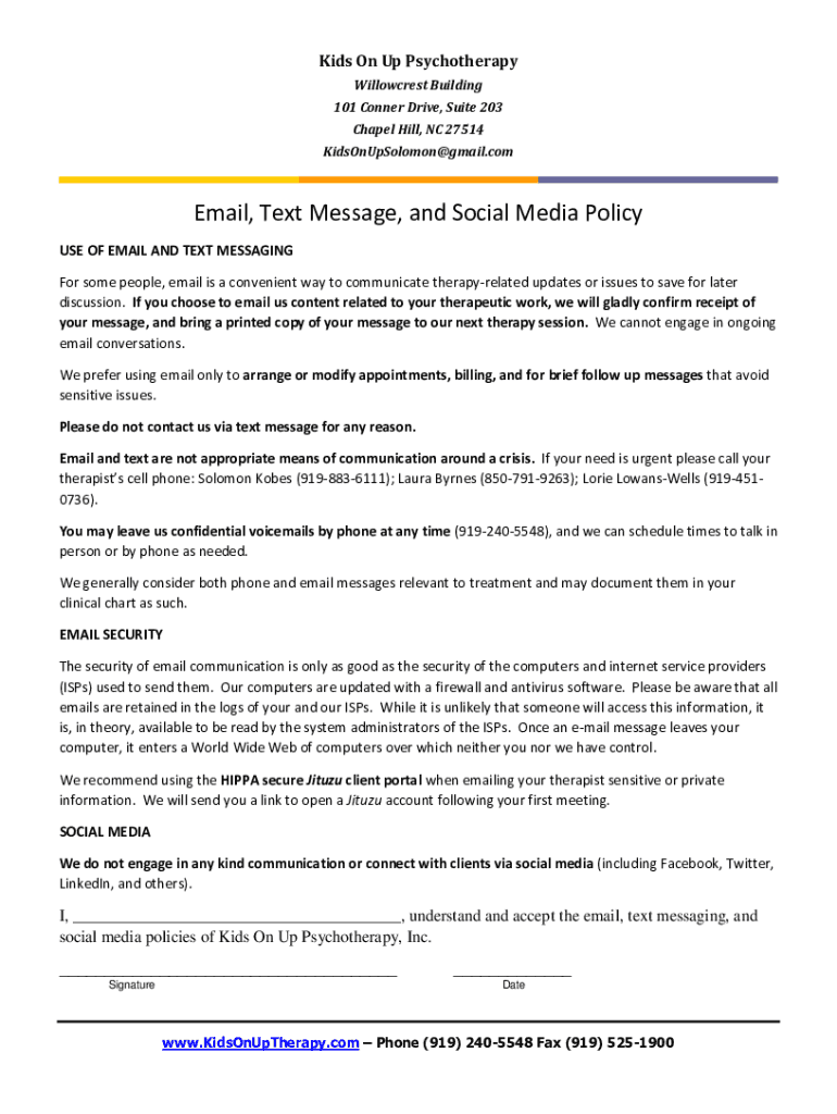 Kids On Up Psychotherapy Willow crest Building 101 Conner Drive, Suite 203 Chapel Hill, NC 27514 KidsOnUpSolomon@gmail.comEmail, Text Message, and Social Media Policy USE OF EMAIL AND TEXT MESSAGING