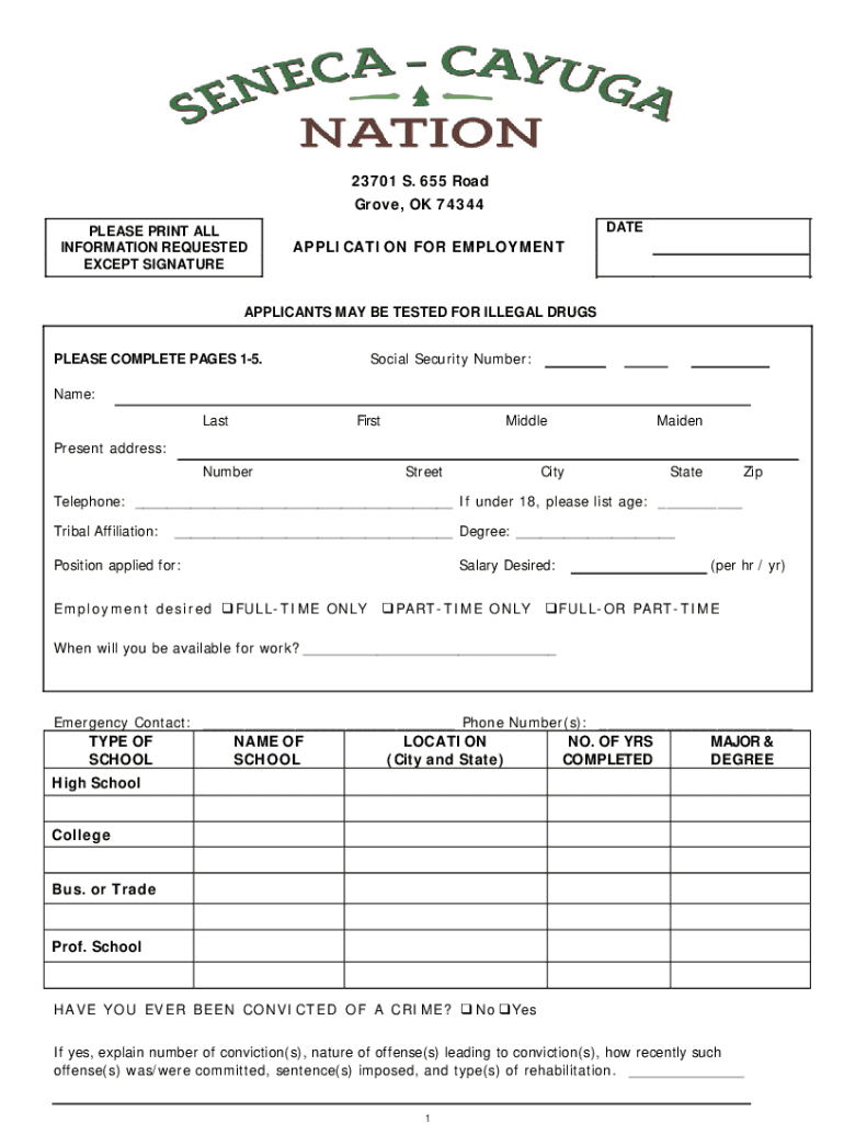 23701 S. 655 Road Grove, OK 74344 PLEASE PRINT ALL INFORMATION REQUESTED EXCEPT SIGNATUREDATEAPPLICATION FOR EMPLOYMENTAPPLICANTS MAY BE TESTED FOR ILLEGAL DRUGS PLEASE COMPLETE PAGES 15. Social Security