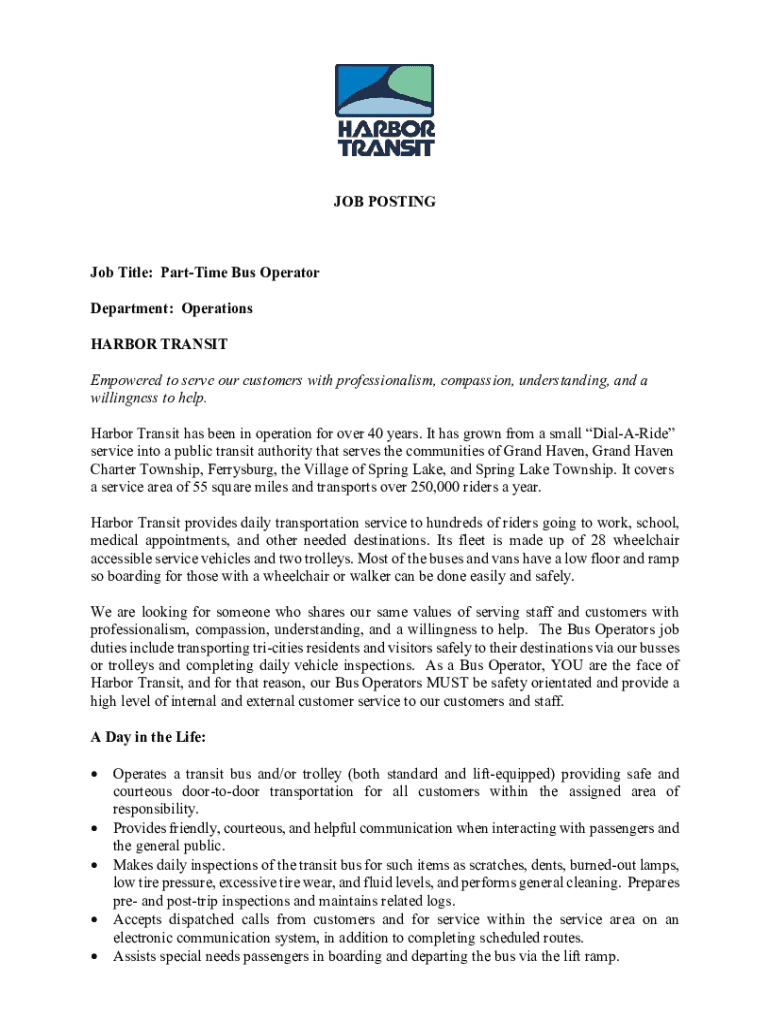 JOB POSTING Job Title: Maritime Bus Operator Department: Operations HARBOR TRANSIT Empowered to serve our customers with professionalism, compassion, understanding, and a willingness to help. Harbor