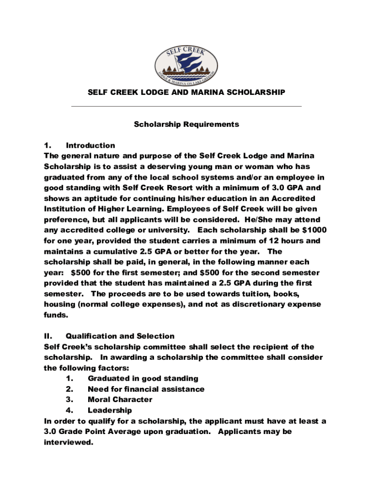 SELF CREEK LODGE AND MARINA SCHOLARSHIP ___ Scholarship Requirements 1. Introduction The general nature and purpose of the Self Creek Lodge and Marina Scholarship is to assist a deserving young man