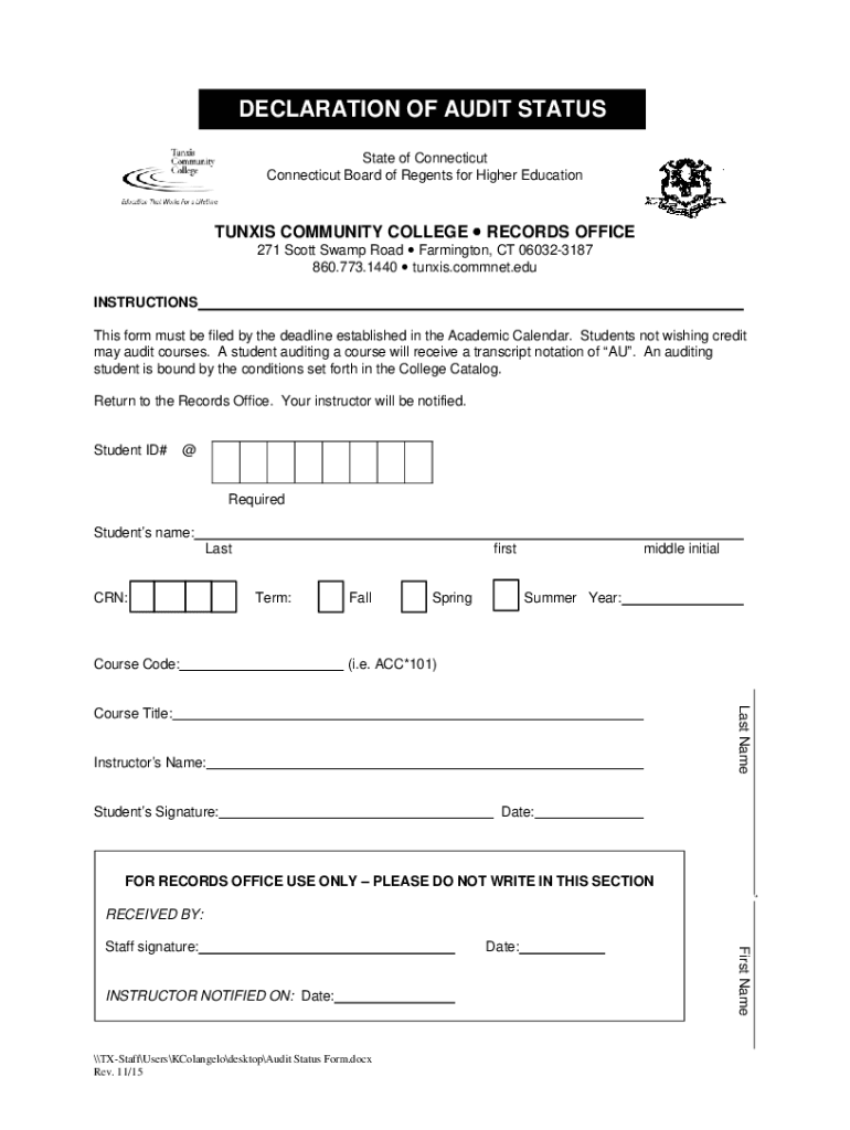 DECLARATION OF AUDIT STATUS State of Connecticut Board of Regents for Higher EducationTUNXIS COMMUNITY COLLEGE RECORDS OFFICE 271 Scott Swamp Road Farmington, CT 060323187 860.773.1440 Tunis.comment.edu