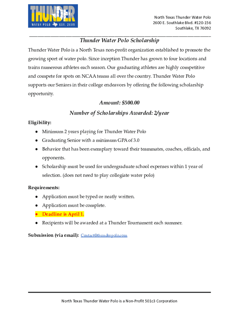 North Texas Thunder Water Polo 2600 E. South lake Blvd. #120156 South lake, TX 76092 ___Thunder Water Polo Scholarship Thunder Water Polo is a North Texas nonprofit organization established to promote
