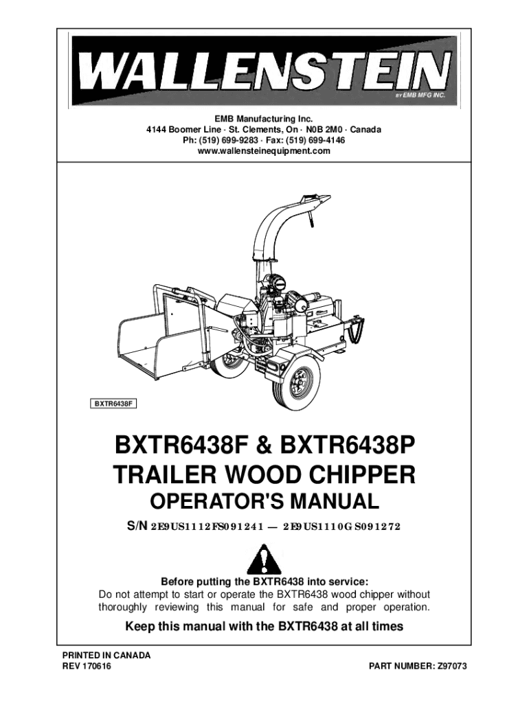 BY EMBLEM INC. MFG INC.BY EMB Manufacturing Inc. 4144 Boomer Line St. Clements, On N0B 2M0 Canada pH: (519) 6999283 Fax: (519) 6994146 www.wallensteinequipment.comBXTR6438FBXTR6438F & BXTR6438P TRAILER