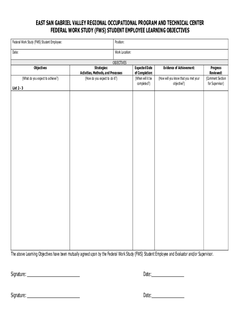 EAST SAN GABRIEL VALLEY REGIONAL OCCUPATIONAL PROGRAM AND TECHNICAL CENTER FEDERAL WORK STUDY (FRS) STUDENT EMPLOYEE LEARNING OBJECTIVES Federal Work Study (FRS) Student Employee:Position:Date:Work