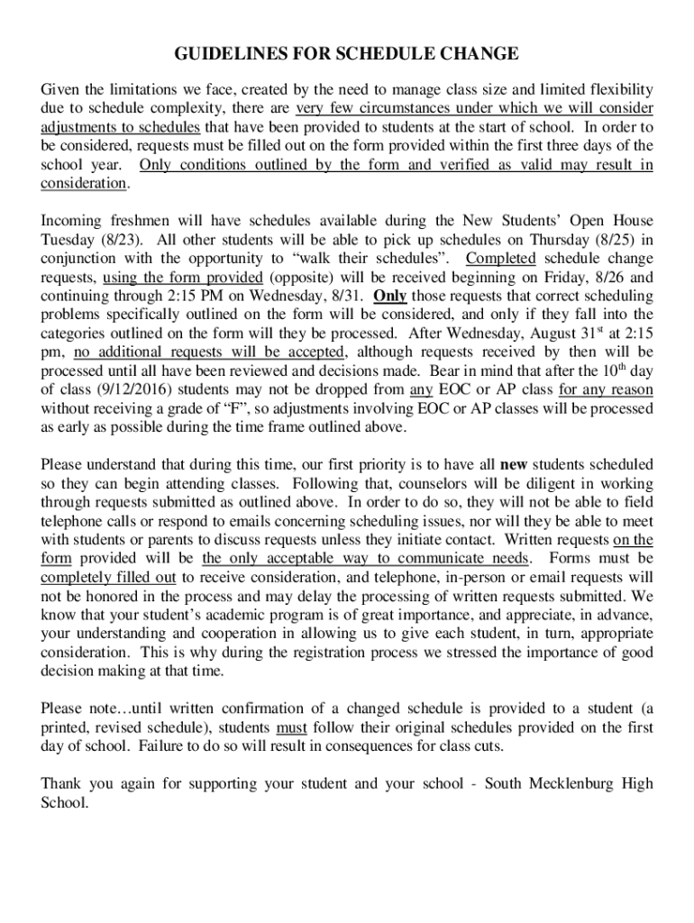GUIDELINES FOR SCHEDULE CHANGE Given the limitations we face, created by the need to manage class size and limited flexibility due to schedule complexity, there are very few circumstances under which