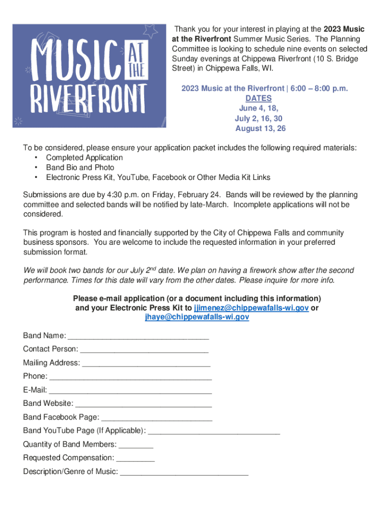 Thank you for your interest in playing at the 2023 Music at the Riverfront Summer Music Series. The Planning Committee is looking to schedule nine events on selected Sunday evenings at Chippewa Riverfront