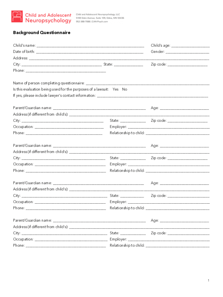 Background Questionnaire Child's name: ___Child sage: ___Date of birth: ___Gender: ___Address: ___ City: ___ State: ___Zip code: ___Phone: ___ Name of person completing questionnaire: ___ Is this