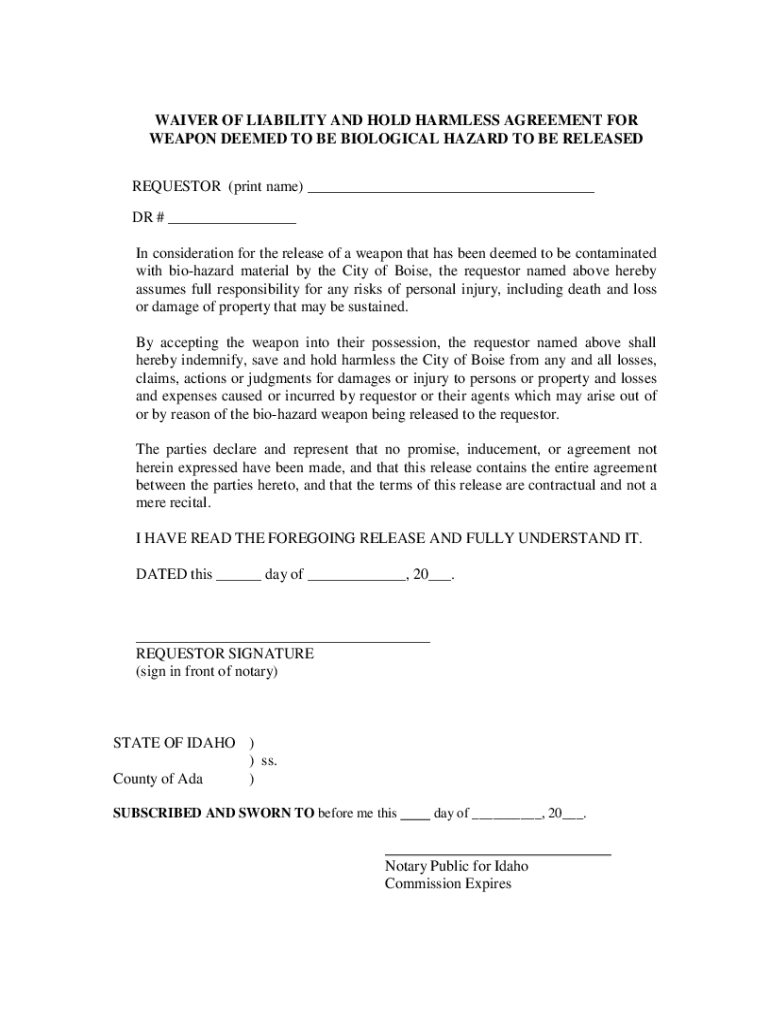 WAIVER OF LIABILITY AND HOLD HARMLESS AGREEMENT FOR WEAPON DEEMED TO BE BIOLOGICAL HAZARD TO BE RELEASED REQUESTOR (print name) ___ DR # ___ In consideration for the release of a weapon that has been