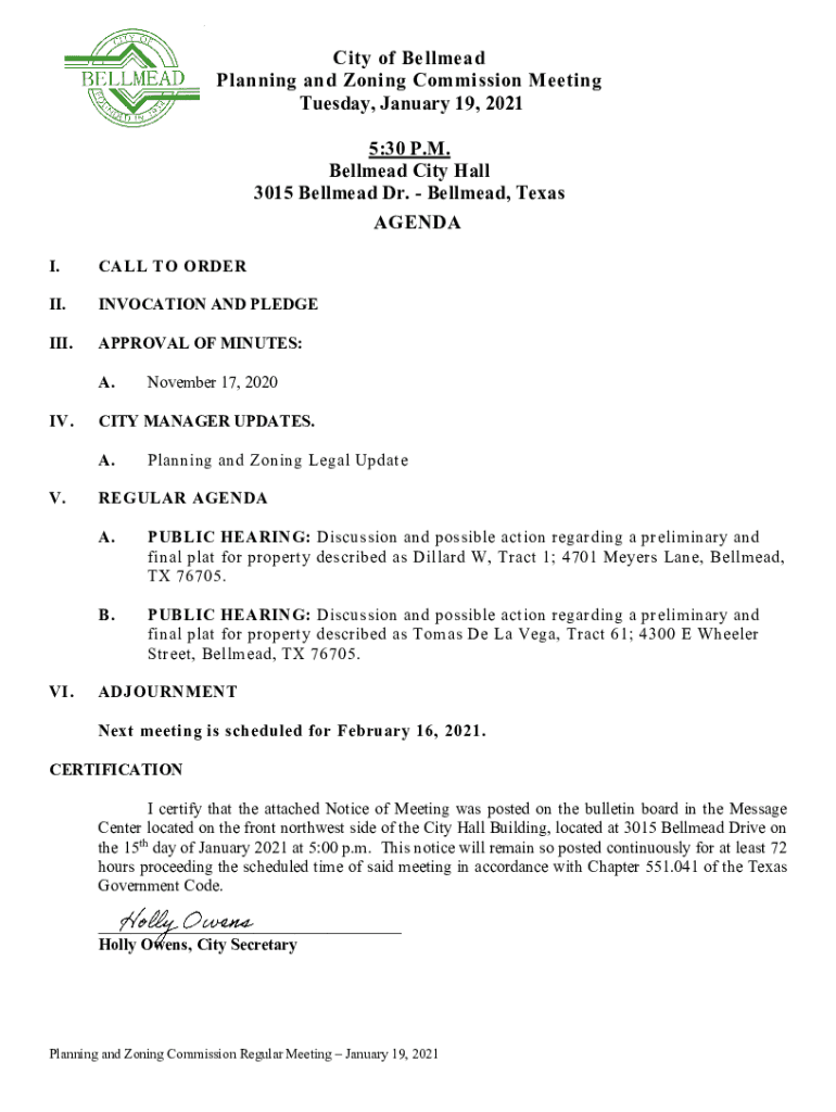 City of Bell mead Planning and Zoning Commission Meeting Tuesday, January 19, 2021 5:30 P.M. Bell mead City Hall 3015 Bell mead Dr. Bell mead, Texas AGENDA I.CALL TO ORDER.INVOCATION AND PLEDGE.APPROVAL