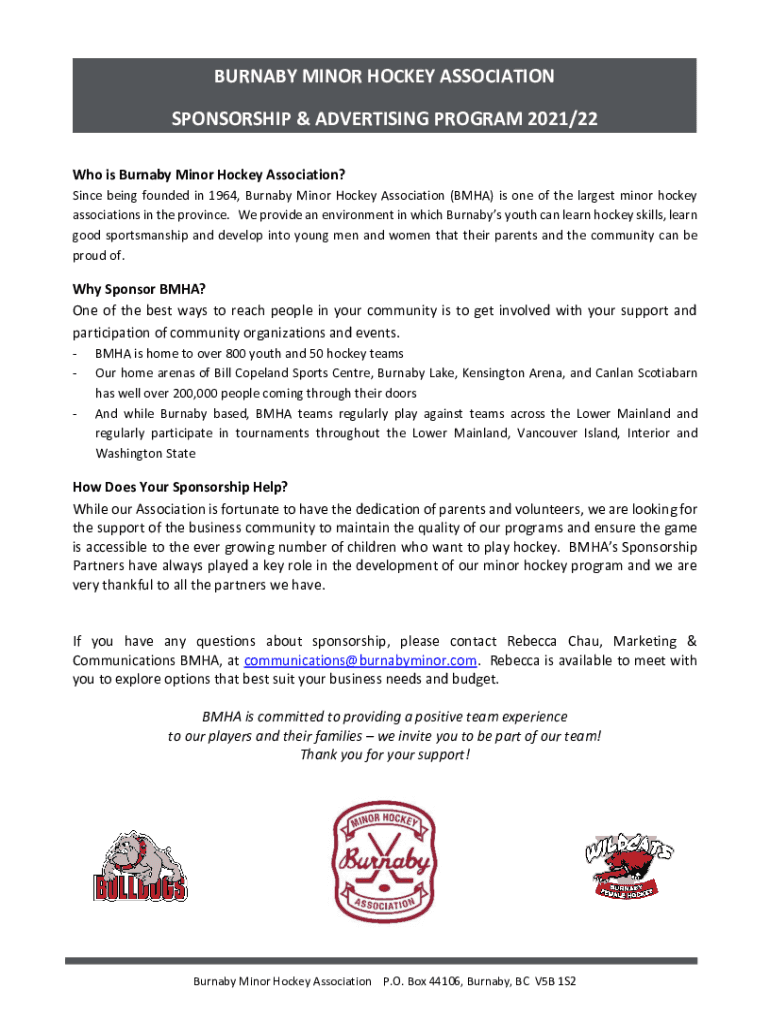 BURNABY MINOR HOCKEY ASSOCIATION SPONSORSHIP & ADVERTISING PROGRAM 2021/22 Who is Burnaby Minor Hockey Association? Since being founded in 1964, Burnaby Minor Hockey Association (BMA) is one of the