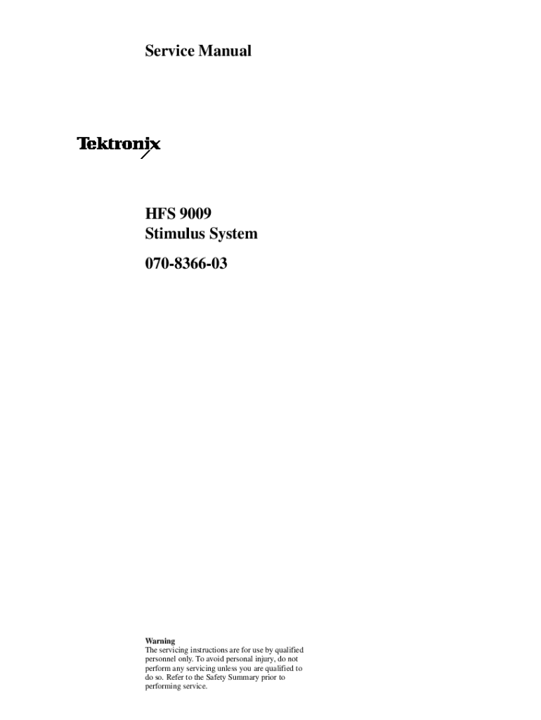 Service Manual HFS 9009 Stimulus System 070836603Warning The servicing instructions are for use by qualified personnel only. To avoid personal injury, do not perform any servicing unless you are qualified