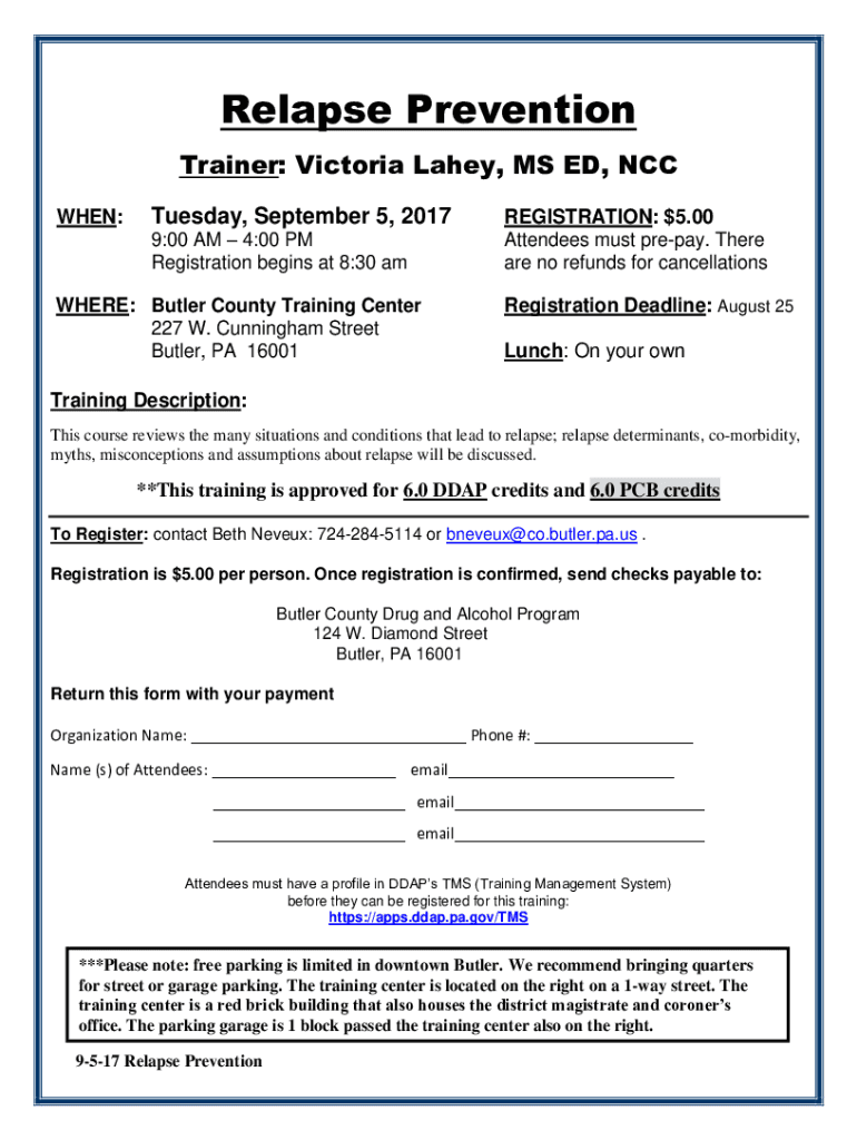 Relapse Prevention Trainer: Victoria Lava, MS ED, NCC WHEN:Tuesday, September 5, 2017 9:00 AM 4:00 PM Registration begins at 8:30 where: Butler County Training Center 227 W. Cunningham Street Butler,