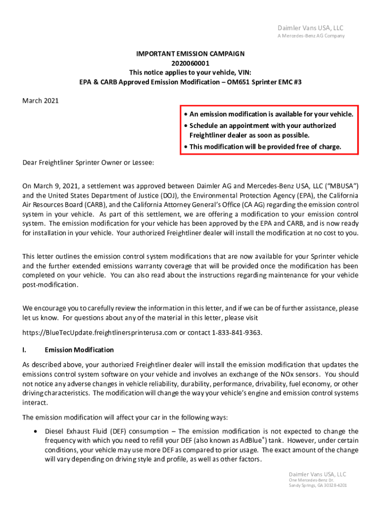 Daimler Vans USA, LLC A Mercedes-Benz AG CompanyIMPORTANT EMISSION CAMPAIGN 2020060001 This notice applies to your vehicle, VIN: EPA & CARB Approved Emission Modification OM651 Sprinter EMC #3 March