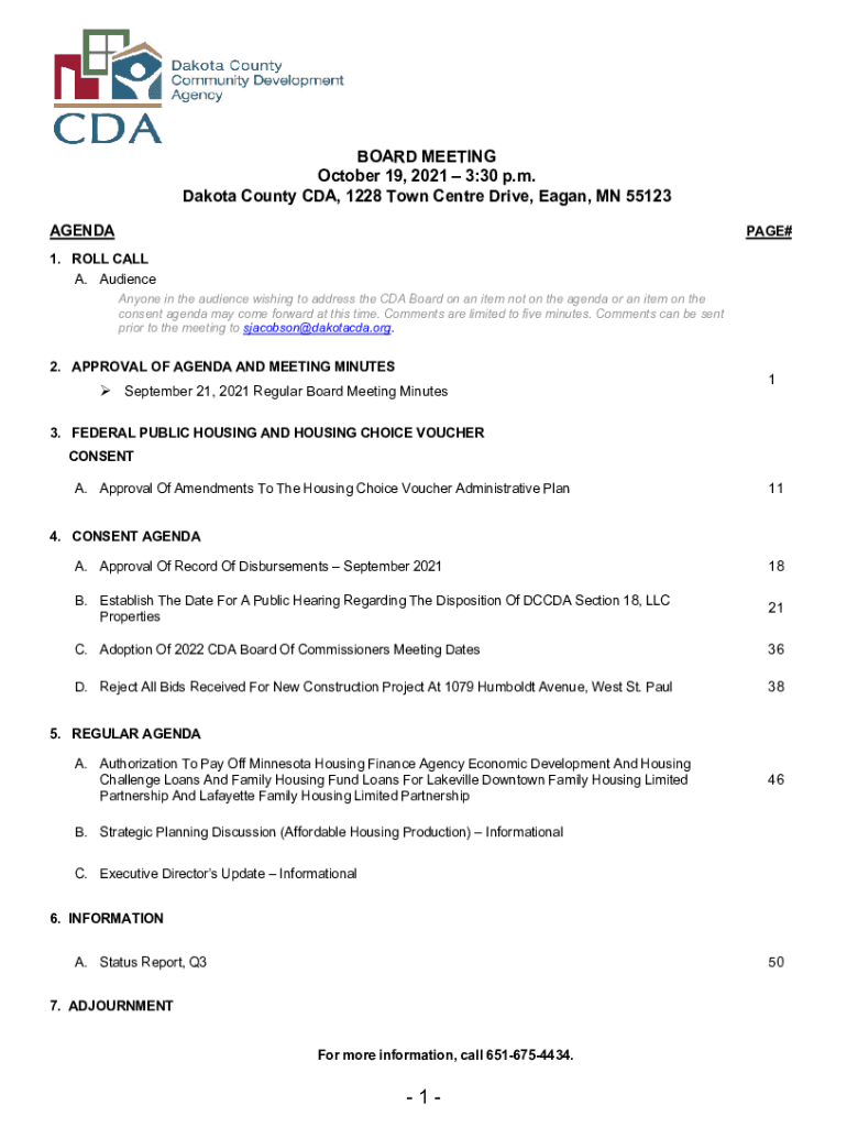 BOARD MEETING October 19, 2021 3:30 p.m. Dakota County CDA, 1228 Town Center Drive, Reagan, MN 55123 AGENDAPAGE#1. ROLL CALL A. Audience Anyone in the audience wishing to address the CDA Board on