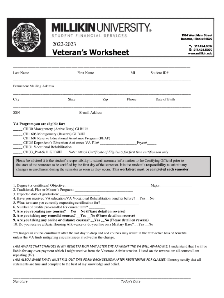 20222023Veterans Worksheet ___ Last NameFirst NameMIStudent ID#___ Permanent Mailing Address ___ CityStateZipPhoneDate of Birth___ Email Address VA Program you are eligible for: ___ CH 30 Montgomery