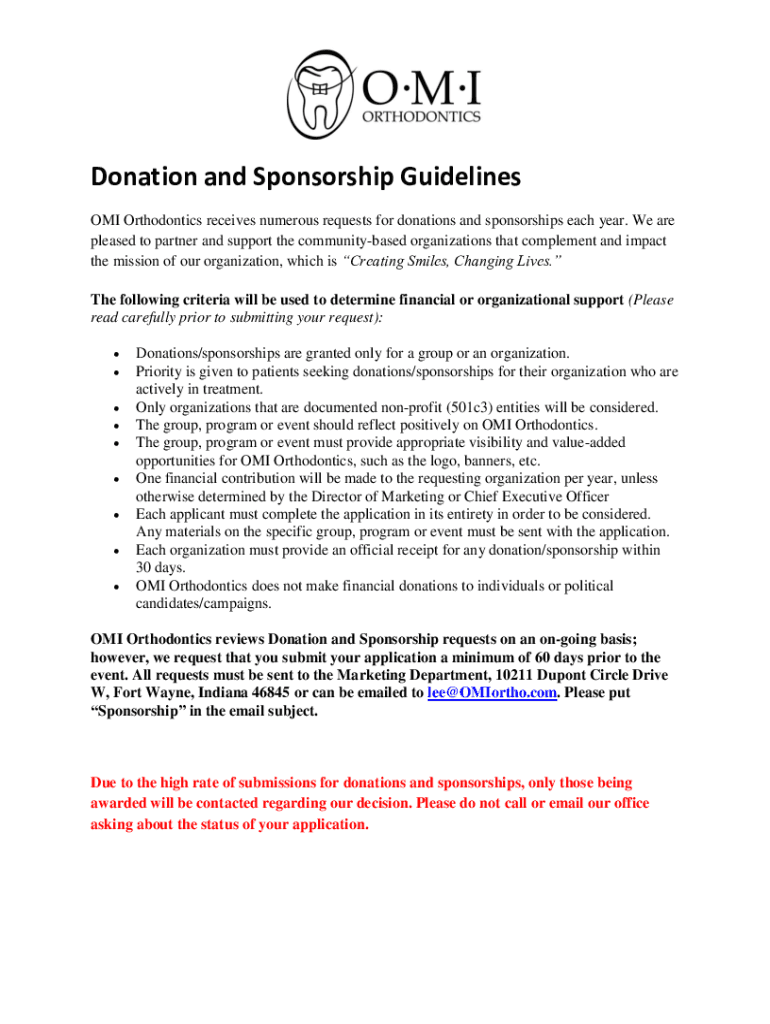 Donation and Sponsorship Guidelines OMI Orthodontics receives numerous requests for donations and sponsorships each year. We are pleased to partner and support the community based organizations that