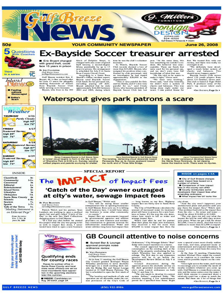 Gulf Breeze50PensacolaYOUR COMMUNITY NEWSPAPERDestinJune 26, 20085 Questions Bayside Soccer treasurer arrested