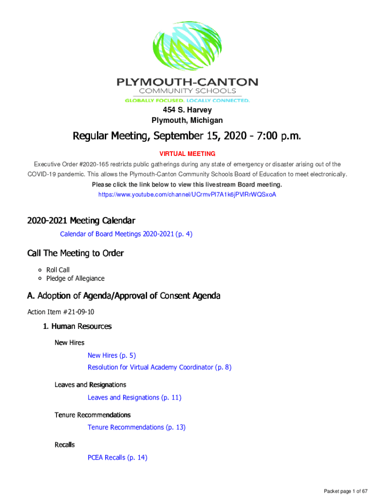 454 S. Harvey Plymouth, MichiganRegular Meeting, September 15, 2020 7:00 p.m. VIRTUAL MEETING Executive Order #2020165 restricts public gatherings during any state of emergency or disaster arising