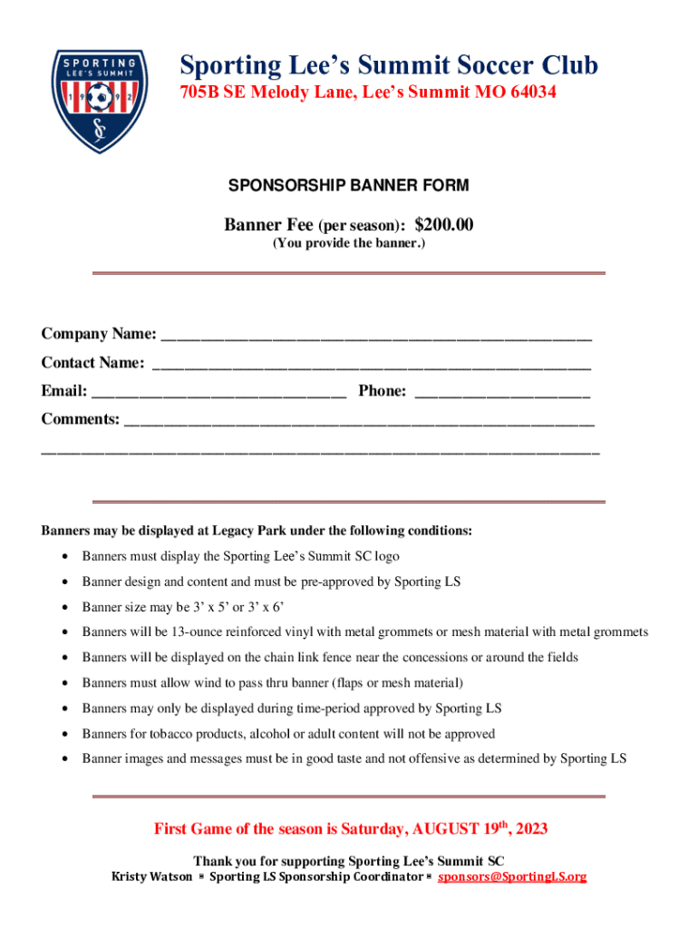 Sporting Lees Summit Soccer Club 705B SE Melody Lane, Lees Summit MO 64034SPONSORSHIP BANNER Forerunner Fee (per season): $200.00 (You provide the banner.) Company Name: ___ Contact Name: ___ Email: