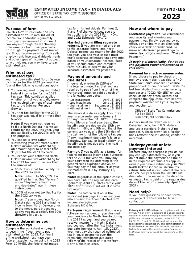 ESTIMATED INCOME TAX INDIVIDUALSForm ND1ESOFFICE OF STATE TAX COMMISSIONER2023SFN 28709 (122022)Purpose of forms this form to calculate and pay estimated North Dakota individual income tax. Individuals