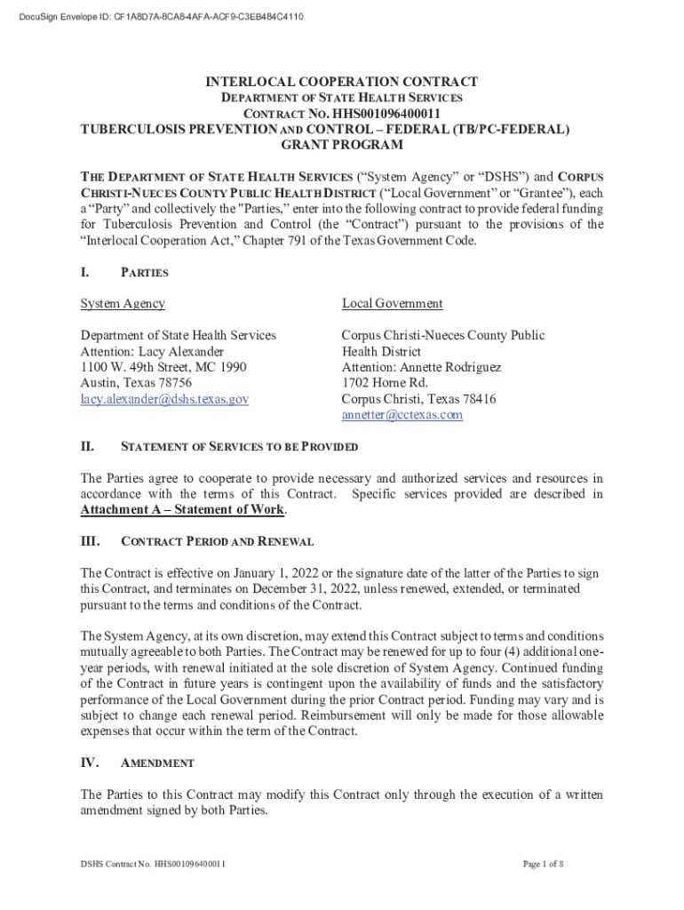 INTERLOCK COOPERATION CONTRACT DEPARTMENT OF STATE HEALTH SERVICES CONTRACT NO. HHS001096400011 TUBERCULOSIS PREVENTION AND CONTROL FEDERAL (TB/FEDERAL) GRANT PROGRAM THE DEPARTMENT OF STATE HEALTH