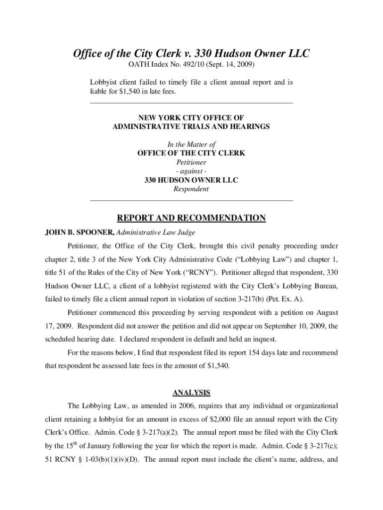 Office of the City Clerk v. 330 Hudson Owner LLC OATH Index No. 492/10 (Sept. 14, 2009) Lobbyist client failed to timely file a client annual report and is liable for $1,540 in late fees. ___ NEW