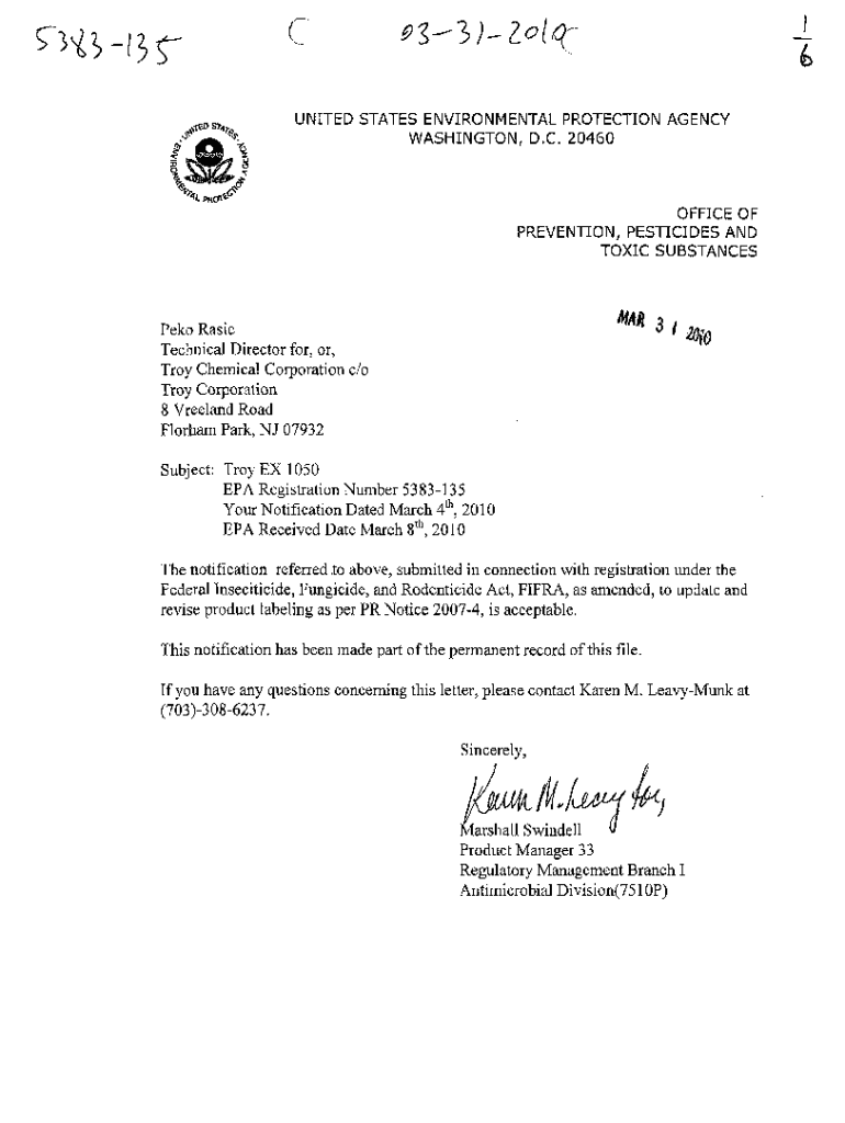 IB UNITED STATES ENVIRONMENTAL PROTECTION AGENCY WASHINGTON, D.C. 20460OFFICE OF PREVENTION, PESTICIDES AND TOXIC SUBSTANCES MAR 3 IPO Basic Technical Director for, or, Troy Chemical Corporation c/o