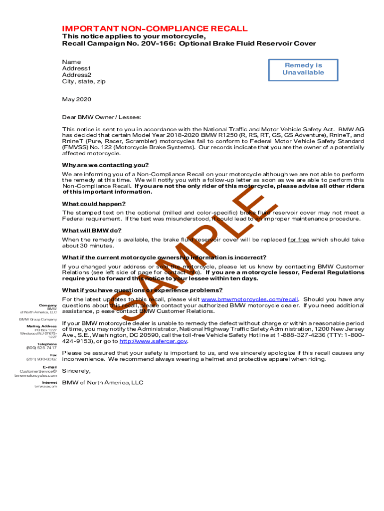 IMPORTANT NONCOMPLIANCE Recalls notice applies to your motorcycle, Recall Campaign No. 20V166: Optional Brake Fluid Reservoir Cover Name Address1 Address2 City, state, remedy is Unavailable May 2020