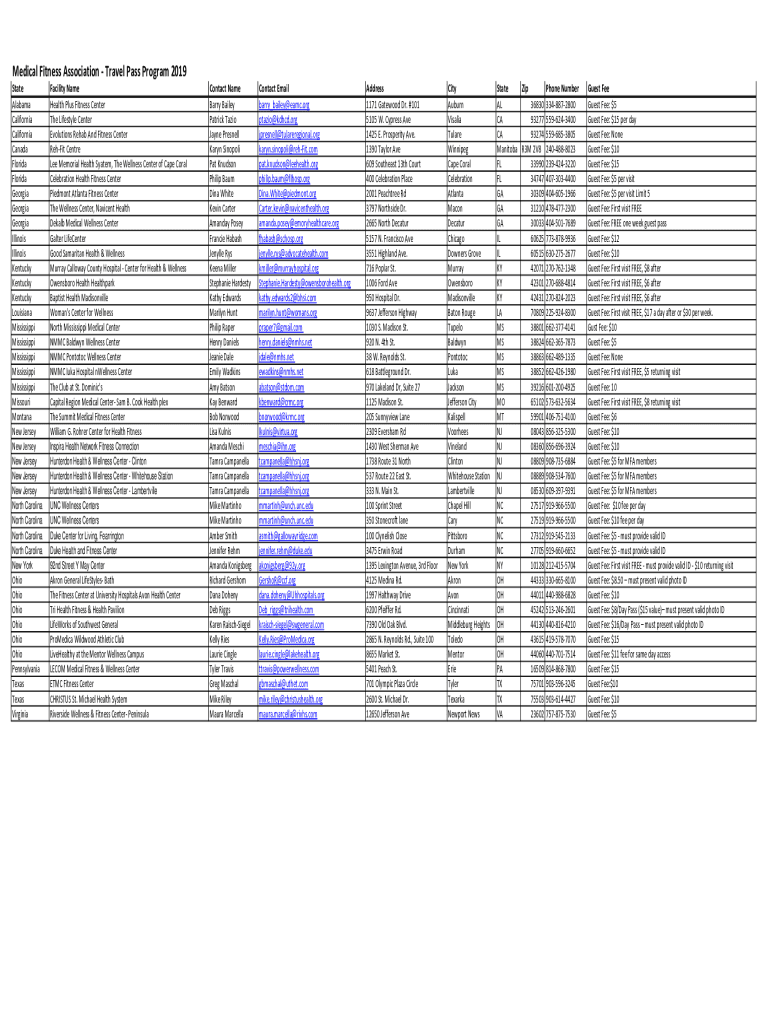 Medical Fitness Association Travel Pass Program 2019State Alabama California Canada Florida Georgia Georgia Georgia Illinois Kentucky Kentucky Kentucky Louisiana Mississippi Mississippi Mississippi