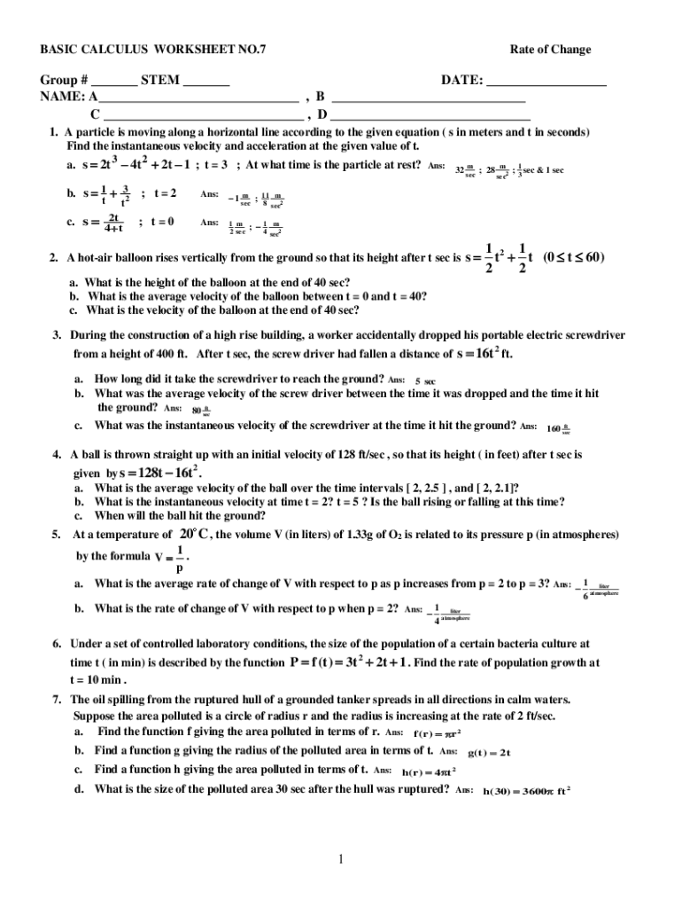 BASIC CALCULUS WORKSHEET NO.7Rate of ChangeGroup # ___ STEM ___ DATE: ___ NAME: A___, B ___ C ___, D ___ 1. A particle is moving along a horizontal line according to the given equation (s in meters