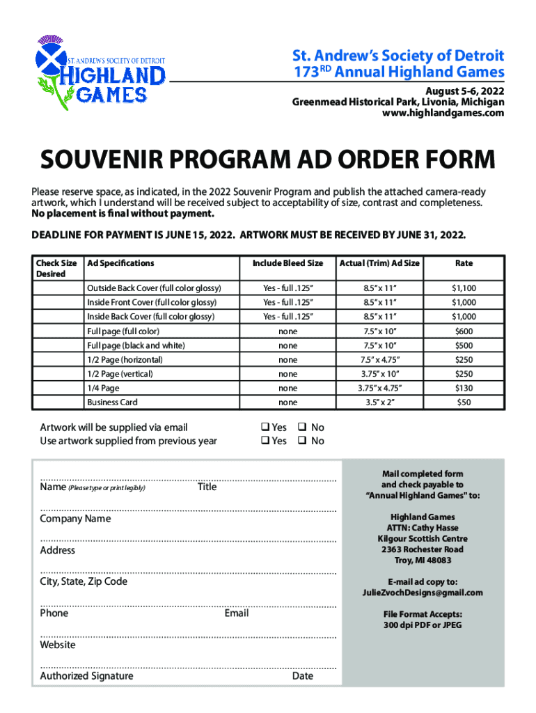 St. Andrews Society of Detroit 173RD Annual Highland Games August 56, 2022 Green mead Historical Park, Livonia, Michigan www.highlandgames.comSOUVENIR PROGRAM AD ORDER FORM Please reserve space, as