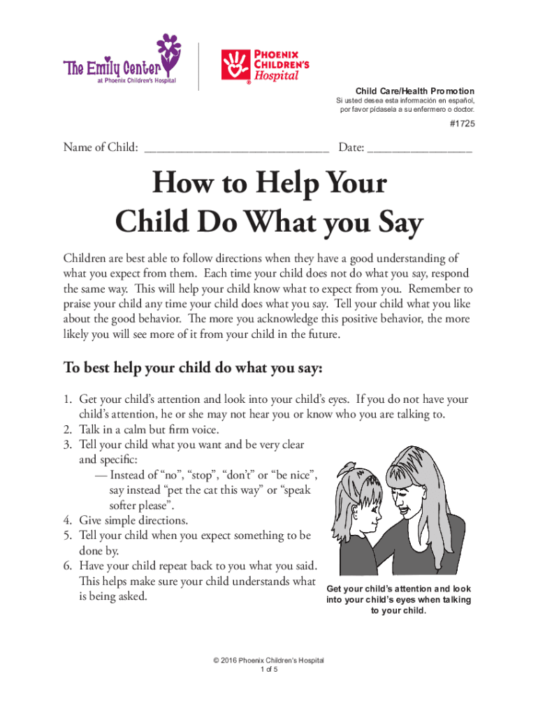 Child Care/Health Promotions used DESE ESTA information en Español, POR favor Pamela a SU enforcer o doctor.#1725Name of Child: ___ Date: ___How to Help Your Child Do What you Say Children are best