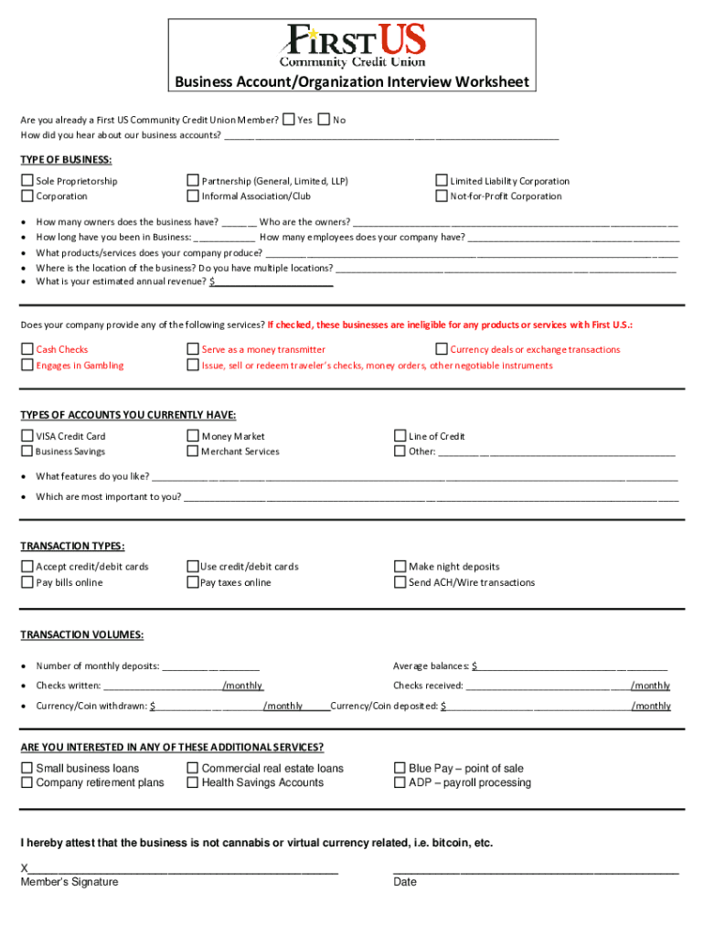 Business Account/Organization Interview Worksheet Are you already a First US Community Credit Union Member? Yes No How did you hear about our business accounts? ___TYPE OF BUSINESS: Sole Proprietorship